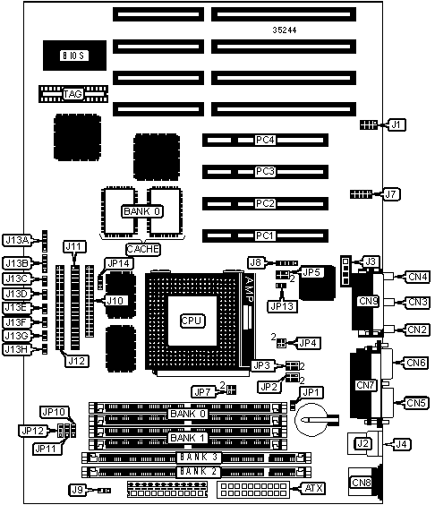 32-bit PCI slots (4), floppy drive interface, game/MIDI port, green PC connector, IDE interfaces (2), parallel port, PS/2 mouse port, serial ports (2), IR connector, USB connectors (2), ATX power connector, line in, line out, microphone in, wavetable connector, audio in – CD-ROM, modem connector
