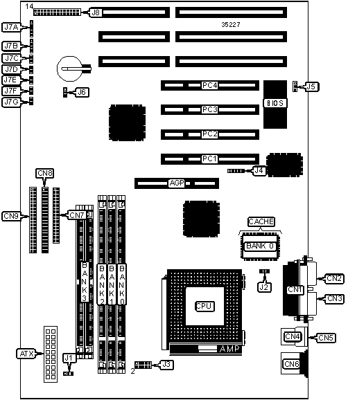 32-bit PCI slots (4), floppy drive interface, IDE interfaces (2), parallel port, PS/2 mouse port, serial ports (2), IR connector, USB connectors (2), ATX power connector, AGP slot