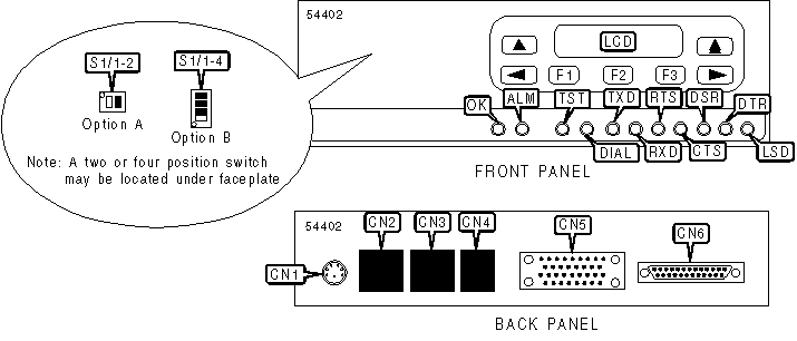 RJ-11 CC/DC out, Network interface via RJ-48 connector (2), power jack, DTE ports (2)