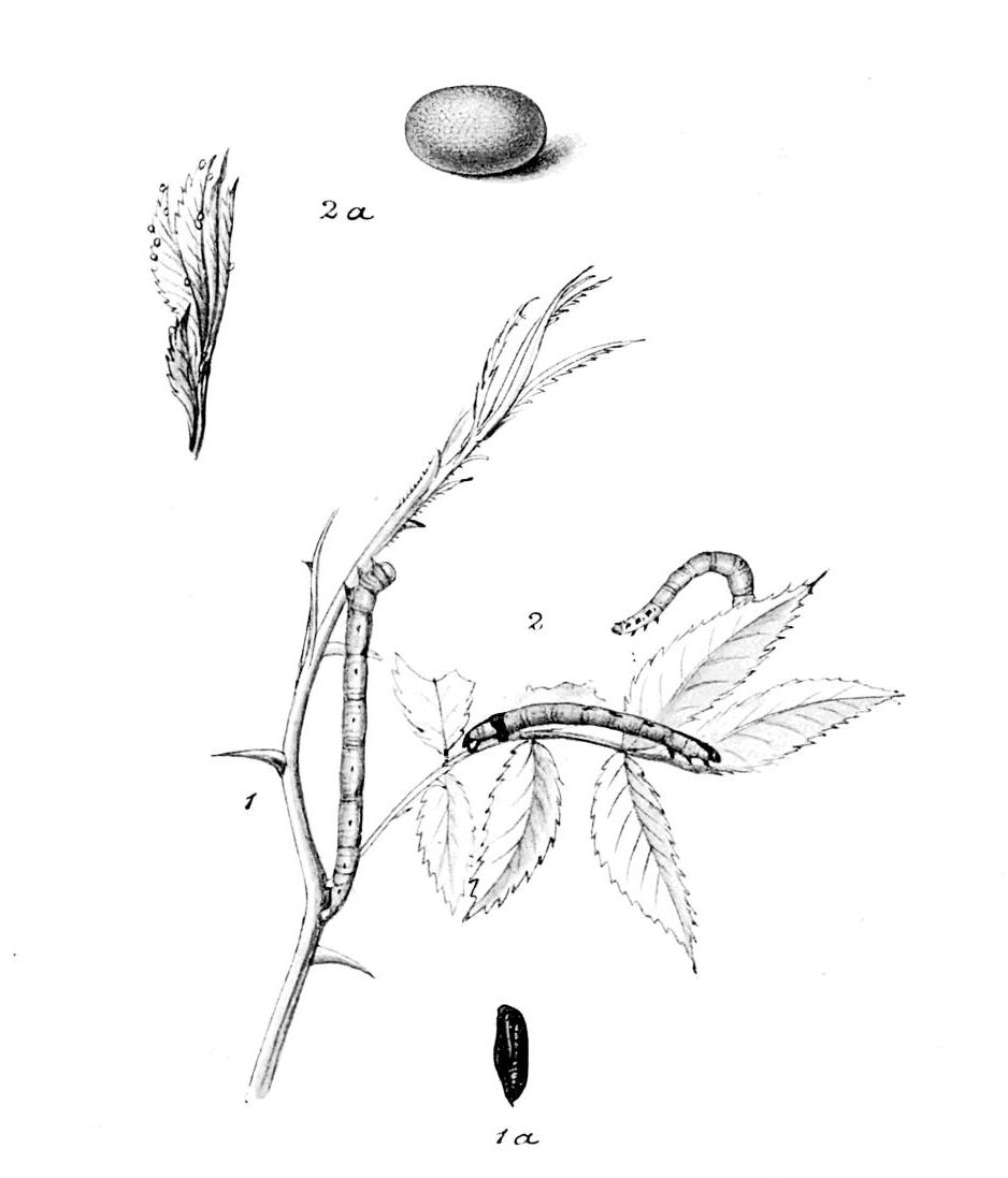 The caterpillar is green, sometimes tinged with olive and freckled with darker green; there are three dark-edged pale-green lines along the back; the under surface is tinged with yellowish, and is separated from the green colour of the upper surface by a whitish stripe, edged above with black; head, brownish, with darker freckles. It occurs in April and May, when it feeds on bramble, rose, oak, sallow, and some low-growing plants.