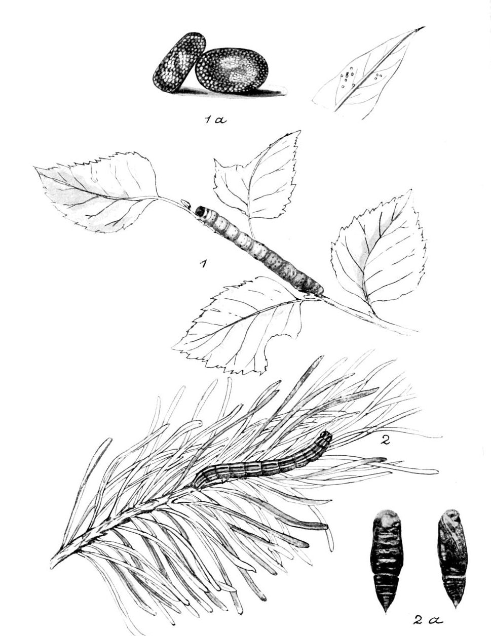 The caterpillar is pale dingy green, dusted with whitish, and yellow between the rings; three white lines along the back, and a double white line along the region of the purplish-edged white spiracles; head, pale yellow, the jaws black, and a small red {6}spot on each side above them. (Adapted from Porritt.) It feeds, from April to June, on the foliage of birch and aspen, and may be found in the daytime between the lower leaves.