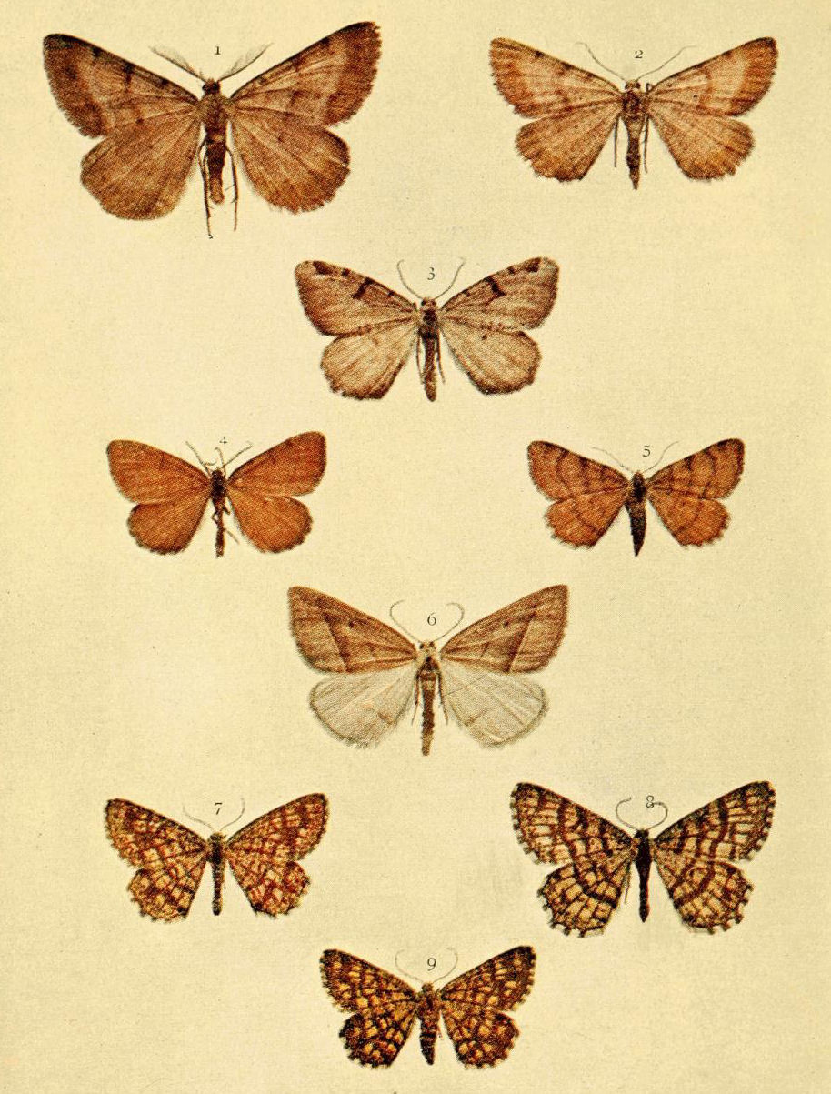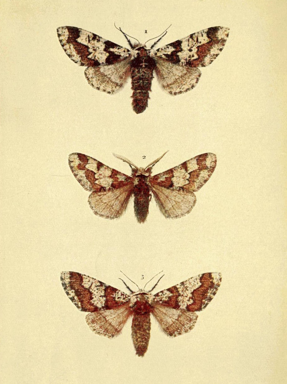 On Plate 9 is shown a male specimen of the typical form (Fig. 1). In ab. ochrea, Tutt, the general colour of the fore wings is ochreous with a greenish tinge, and so it differs from the type, in which the ground colour is reddish. In another ochreous form the cross bands are of a purplish tint (ab. punica, Borkhausen), and in ab. rufina, Hübner, the bands are also purplish, but the ground colour is of a somewhat brighter red than in the type. Ab. unicolor, Tutt, is dull reddish with indistinct cross markings, and seems to be a modification of the almost unicolorous form of a bright red colour, ab. rufa, Tutt. (Fig. 2.)