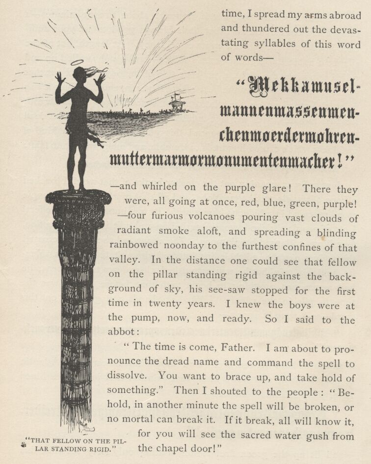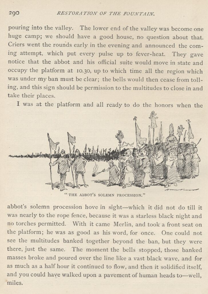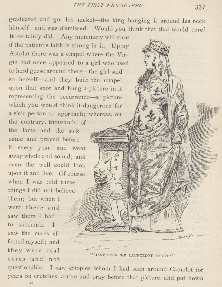 It was in Warwick Castle that I came across the curious stranger whom I am going to talk about.  He attracted me by three things: his candid simplicity, his marvelous familiarity with ancient armor, and the restfulness of his company—for he did all the talking. We fell together, as modest people will, in the tail of the herd that was being shown through, and he at once began to say things which interested me.  As he talked along, softly, pleasantly, flowingly, he seemed to drift away imperceptibly out of this world and time, and into some remote era and old forgotten country; and so he gradually wove such a spell about me that I seemed to move among the specters and shadows and dust and mold of a gray antiquity, holding speech with a relic of it!  Exactly as I would speak of my nearest personal friends or enemies, or my most familiar neighbors, he spoke of Sir Bedivere, Sir Bors de Ganis, Sir Launcelot of the Lake, Sir Galahad, and all the other great names of the Table Round—and how old, old, unspeakably old and faded and dry and musty and ancient he came to look as he went on!  Presently he turned to me and said, just as one might speak of the weather, or any other common matter—