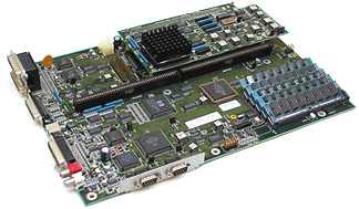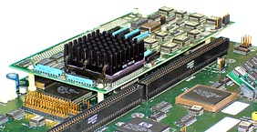 The Amiga's Motorola 68040 Central Processor Unit (CPU) is not part of the motherbord, but instead on a independant board of it's own, with a few additional support chips. This board then plugs into the processor slot on the Amiga motherboard, as seen here on the right.