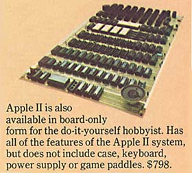 In the spirit of the original computer hacker, the Apple II was also available as a circuit-board only, without keyboard, power supply, or case, as seen here on the right.
