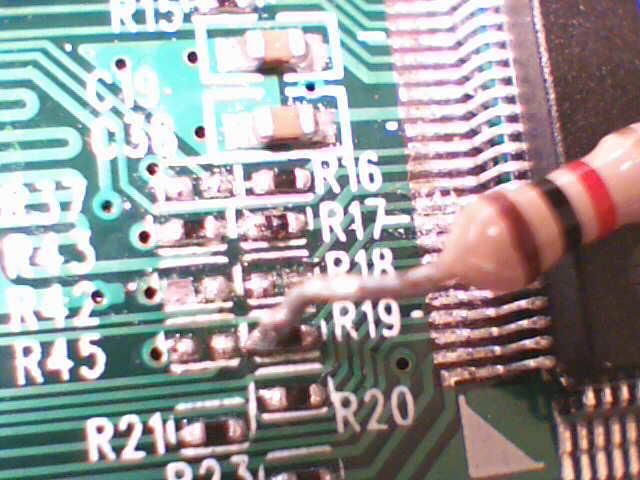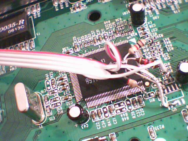 In the picture above, you see the RTL8136B with the strapping resistor on pin 121. The chip has 128 pins, numbered counterclockwise starting from the bottom left corner (near the white triangle). Pin 128 (power supply, incidentally) is just above the triangle, pin 121 just a little bit above. The pin is actually one of the TxD (for port 5), and it has in series a 50 Ohm resistor, labeled R19. Next to it there are spare pads for R45, which is exactly the strapping resistor that I need. Not having a small enough device, i carefully soldered the resistor on one of the pads of R19, and the other terminal goes to the power pad where you could also connect the serial EEPROM to store configuration information.