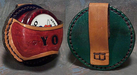 Yomega - genuine leather, but I don't like the unprotected snap on the inside, which could damage a hardwood yoyo.