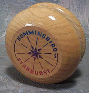 * - "Hawaii" - wood yo with a Hawaiian ceremonial helmet design of some kind. Doesn't really play, since the sctring is embedded in the axle, and will not allow the yo to sleep. Pretty design, though.