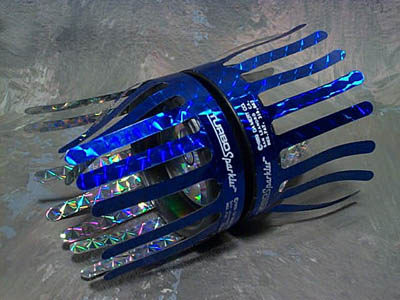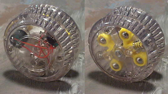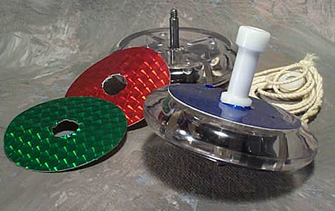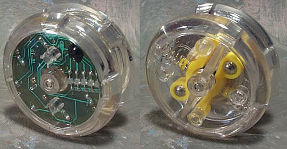 *** - Strobe-Yo - Yomega transaxle design, but with LEDs in the rims, one on each side. The LEDs turn on when you touch a contact on either side of the yo, and ramain on as long as you play. They can be turned off by pressing an internal button with a special pin, or allowed to turn off automatically after a few minutes at rest. It plays ok, but it's pretty heavy, and the light aren't as impressive as the one below. With a hefty price tag around $40, it's a hard sell to anyone but a collector.