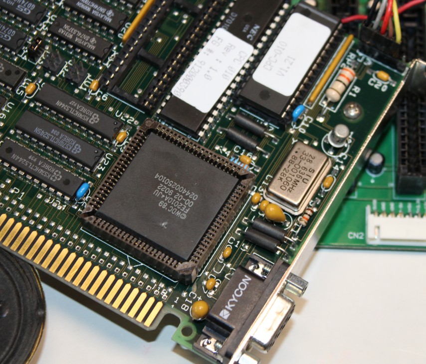 The BIOS chip is a 26-pin EPROM with the marking "CPC-010 V1.21". The sticker might be covering up a UV-erase window, though later EPROMs were electrically-erasable instead.