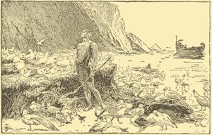 In the morning Polyphemus opened the door, and sitting in it, let his sheep pass out, feeling each one, so that the Greeks might not escape. But the crafty one fastened himself and his remaining comrades under the breasts of the largest sheep, and so, hidden by the wool, escaped unnoticed. They hurried to their ship and put out to sea. And now feeling safe, Ulysses shouted to the blind monster and taunted him, whereon, rushing to the shore, Polyphemus lifted up a vast rock and hurled it toward the sound he heard. It almost struck the vessel, and its waves swept the little craft back to the land. In great haste they shoved off again, and when they felt safe, shouted at him once more. He followed them, hurling rocks, but now they were beyond his reach and returned safely to their companions.