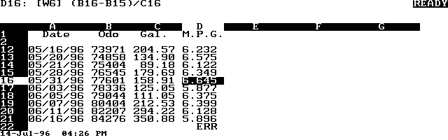 Another important use of 1-2-3 is for tracking fuel mileage. With the high price of diesel fuel these days a sudden drop in fuel mileage due to a mechanical problem can cost me a significant amount of money. After entering my mileage in column B, the gallons in column A, a formula entered in column D figures mileage. Every time I fill up I have my fuel mileage in a few quick easy seconds.