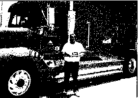 Rick Hurtle with his 1996 Freightliner (equipped with custom stereo system, sink, microwave, refrigerator, and 18" DSS satellite dish) and HP 200LX Palmtop.