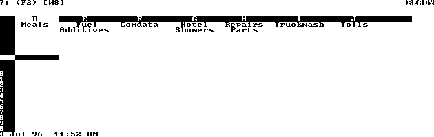 On one spreadsheet I keep track of my meals, hotels, repairs, tolls, insurance, and all truck-related expenses. I record totals each month, and at the end of the year I can enter all of them on another spreadsheet to give to my accountant. I keep the titles and columns in a file called START.WK1 and then each month I just copy it to the spreadsheet for the currant month like JUN96.WK1.
