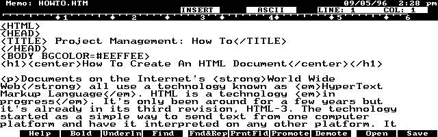 The above screen shows the HTML document HOWTO.HTM loaded into Memo. You can read the text and even see the Hypertext Markup tags, but to see how the document looks on the Web, you need to view it with a Web browser (also called a Web reader).