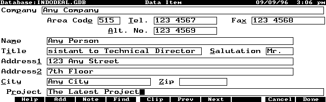 Then open your modified Phone Book, highlight the name you want to send a fax to and start your macro. After running, the macro ends in the archive database (FMS-CLOG.GDB) with the cursor in the field named RE. Fill in what the fax is regarding and press (F10) to save the new entry.