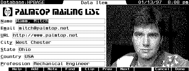 I also have GDB databases for my book and CD collection, phone area codes, Internet domains and interesting sites, and even one for the members of the HP Mailing list with their pictures. iPeX =, by Tsumori "Brahma" Masaki, is a brilliant program that will allow you to show PCX or ICN files inside your database files. By loading a small TSR, you can show a picture by including a simple code in your database or DataCard templates.