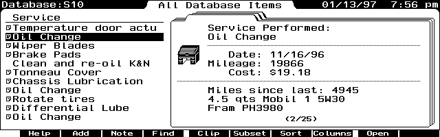 Since gas mileage is an excellent indicator of a vehicle's health, this lets me know when I need to spin some wrenches and correct problems before they get serious. All of my maintenance records are kept in a little GDB database so I will always know when it's oil change or tire rotation time.