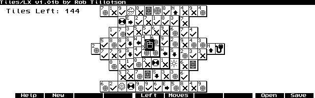 I came across two new games for the palmtop. The first is shareware TILES, a Mah Jongg-like solitaire game where the player removes matched pairs off a pile (see screen dump on previous page). I am not sure why the fascination, but it is challenging and addicting to try to find matches and eliminate the pile.