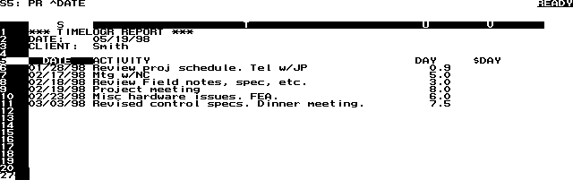 Whenever I start a project I can press ALT-S, enter the client or other identifier and the billing rate. When I'm done, I press ALT-F. That's it! If I need to make changes to the times, I press ALT-E. For billable time, I use a 4-letter project identifier, which I also use as a prefix to name all files relating to the project (Screen 3).