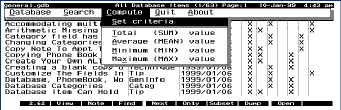 Many other database programs have the ability to generate printed, columnar reports, complete with subtotals and grand total. The Database engine in the HP Palmtop does not have such a function. However, several users have found that you use the Smart Clip function to produce the raw material for a columnar report. The Smart Clip function will let you set the spacing for each output field. You can also specify whether you want data to be right or left justified or centered in a printed column. Granted, getting the Smart Clip to produce a readable report using the built in spacing commands takes some trial and error.