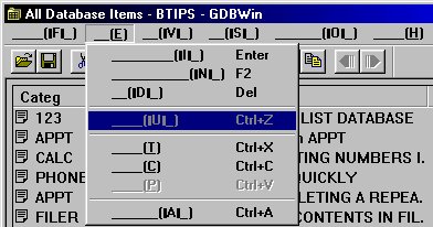 GDBWin is a program for Windows (9x/NT/2000) that lets you access GDB, NDB, and PDB files created on the HP 100/200LX. It doesn't work with Appointment Book or World Time files. The program will let you view and edit information in the database files. It will let you add or delete category words and subsets. However it will not let you create or modify a database. You must create custom databases on the Palmtop (or in CPack) before they can be accessed with GDBWin. As a result the program is of use only to owners of the HP 100/200LX Palmtops.