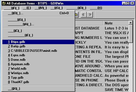 The GDBWin program, in spite of its unfinished feel, is still one of my favorite ways to use Win98. I have yet to see GDBWin crash the operating system. It works well-well enough that I wish the author would have completed this excellent piece of programming and made it useful for English usage. It truly makes viewing and modifying the contents of database files a lot easier than CPack or even the LX itself.