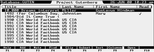 After deciding on a format for the database, I decided that I wanted to have a working knowledge of each of the files in the Project Gutenberg section of the CD InfoBase. Hence, I didn't "copy and paste" from a computer generated list of files. Instead I chose to enter all information into the database the old fashioned way: type it in word for word and character by character.