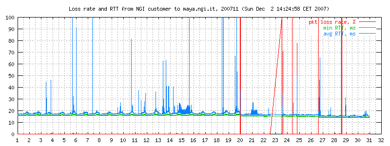 Apart from the trivia on the Telecomitalia technical support, the graphs below contain RTT and loss data over a number of months, and also a picture of the carrier state on my particular DSL line, which is affected by an annoying noise that regularly appears at 5.45 and disappears at midnight. See the full graphs.