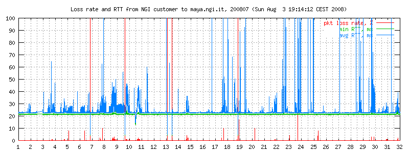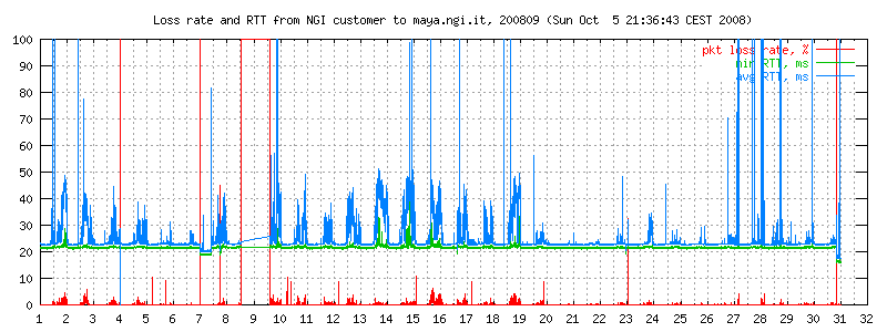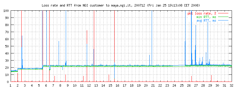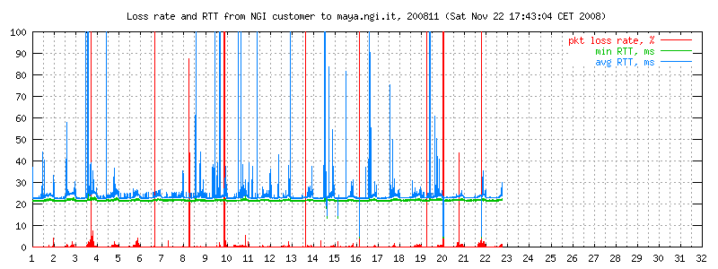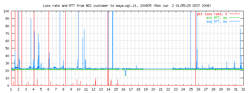 I dati sono misurati ogni due minuti con ping -i 0.1 -c 300 maya.ngi.it in modo da ottenere un campione significativo. Il traffico generato corrisponde a 10 pacchetti/640 bytes al secondo, e normalmente non esiste altro traffico sulla linea. I grafici rappresentano il round trip time minimo e medio, e (curva in basso) la loss rate. La linea è usata prevalentemente per traffico interattivo dell'ordine di pochi kbit/s.