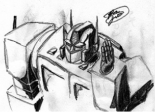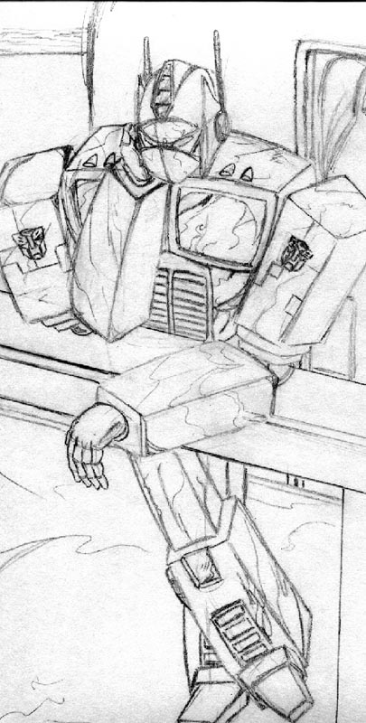 - Optimus-Dazed - This is a sketch, in the very beginnings, but none the less a work. Optimus is depicted here as being in a daze, a state of immense thought. (91k, 12-1-00)
