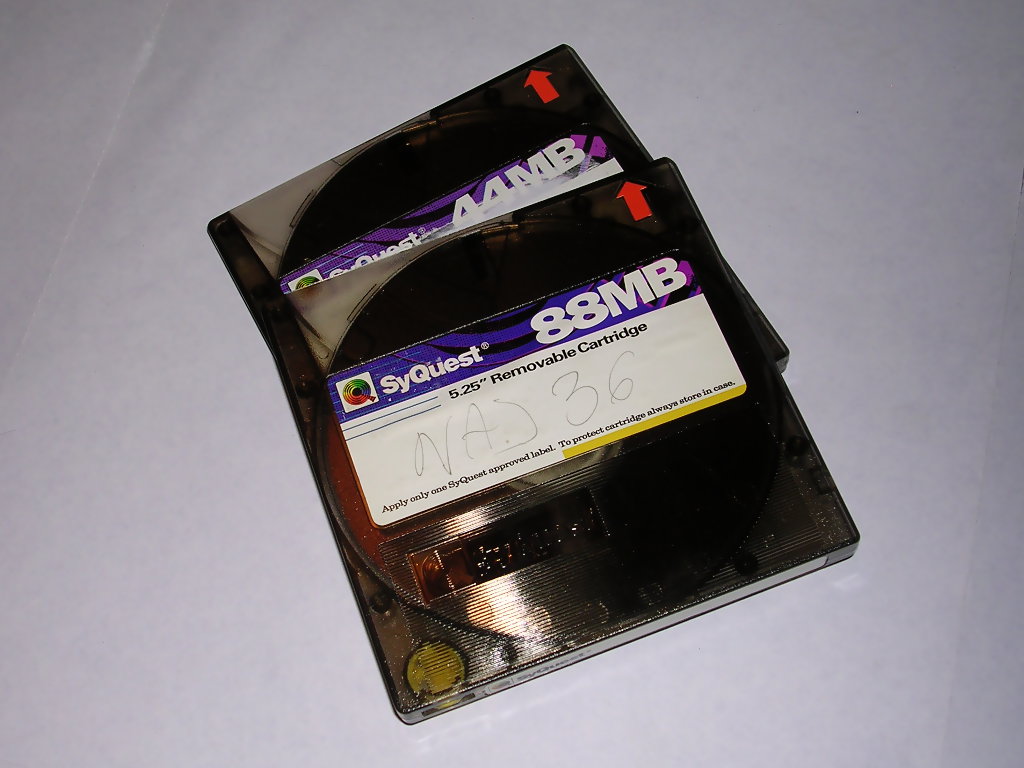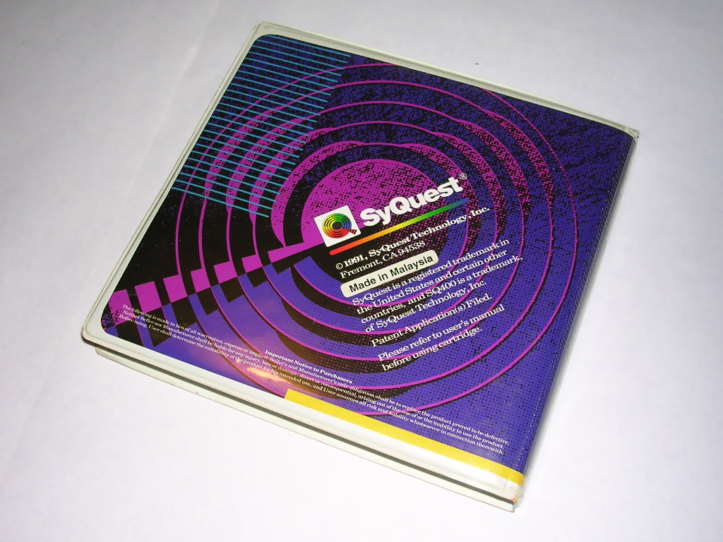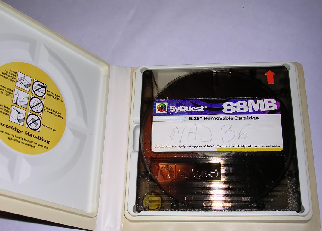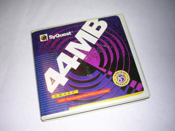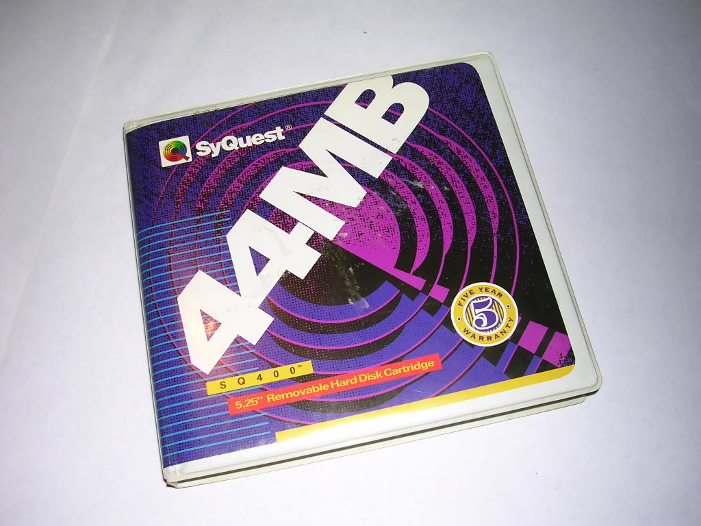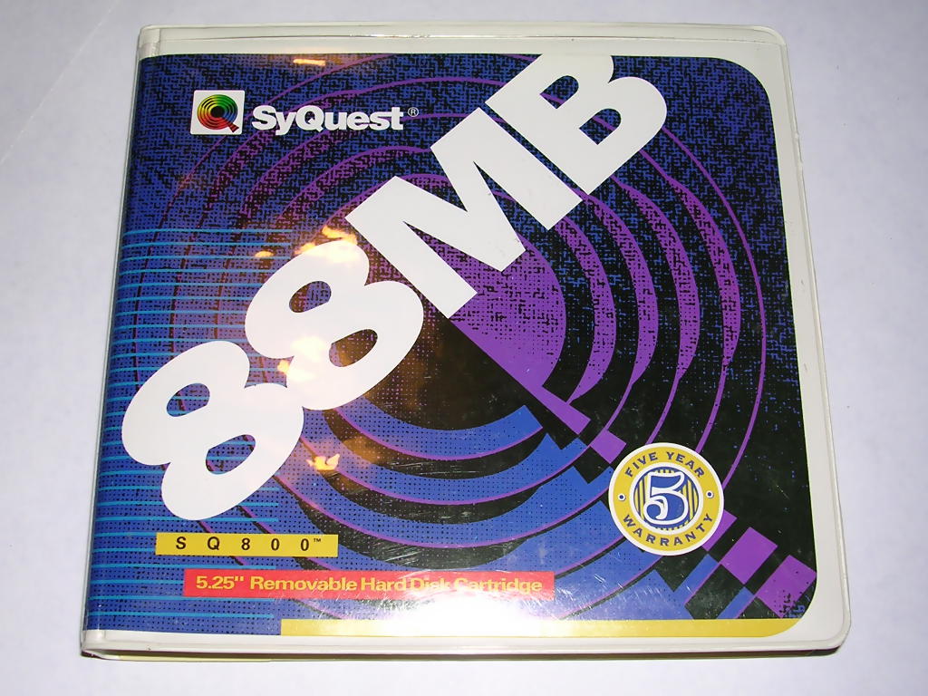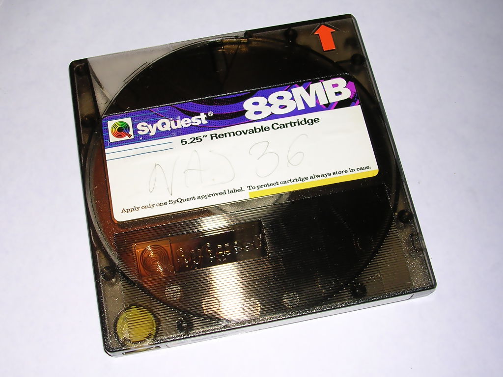 Like JAZ, SyQuest developed their own standard of replaceable platter cartridge drives. These drives weren't popular in everyday use, but got some popularity in DTP and CAD design studios to move large design files to printing. There were 44 and 88MB disks, later drives used larger ones - 200MB or even 4GB.