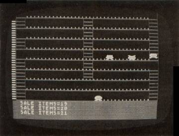 The object of "Closeout" is to snatch up as many sale items as possible while evading the hostile bargain hunters. Don't let them get too close, because they'll either capture you or shoot you. Some of them can shoot farther than others. You can shoot back with the slingshot you bought in the Sporting Goods Department (50 percent off), but since slingshots require two hands to shoot, you must drop 25 sale items each time you use it.
