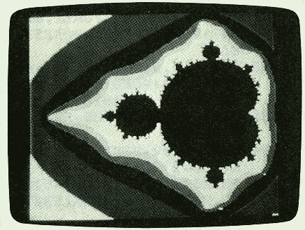 While Mandelbrot sets have certain practical applications, they can produce striking results when you translate the numeric values into different-colored points on a computer screen. These programs color each point on the hi-res screen according to how fast it grows during the iterative (repetitive) process. Computing the entire set requires an enormous number of calculations, so all of these programs take some time to complete--many hours in some cases. You may want to start a program running at bedtime so the picture will be finished by the next morning. (There's no need to leave the monitor on all night, of course.)