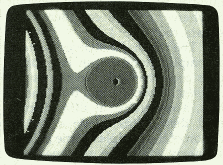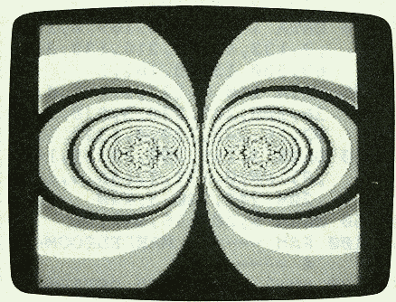 Program 2 uses the color schedule to paint patterns that resemble the magnetic lines of force between two wires charged with electricity. Displays of this type make it easier to visualize forces such as electromagnetism, which are invisible to the naked eye, yet have a profound effect in the world around us. Of course, you can enjoy the displays even if you don't understand the scientific concepts involved in these simulations.