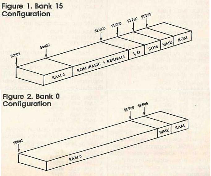 As mentioned earlier in this series of articles, the Commodore 128 has the ability to reconfigure its memory in many different ways. Certain standard configurations have been defined as banks. For example, Figure 1 shows the configuration called bank 15. Many programmers use this configuration. However, since the program must be in RAM, this means your program itself must fit into the area below address $4000. Figure 2 shows the configuration for bank 0. This bank contains plenty of RAM, but no input/output (I/O) chips and no Kernal operating system in ROM to perform I/O tasks.