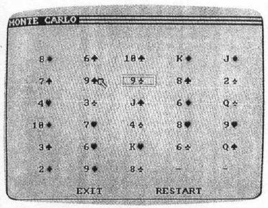 This version of Monte Carlo (Program 1) sports excellent sound effects. Move the cursor with the cursor keys and press RETURN to select a card. Press Q to quit a game and start a new one.