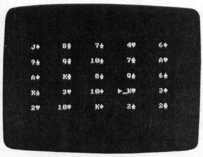 Except for the Amiga version of the game, all versions use the cursor control keys to move a pointer on the screen. When the arrow is pointing to one of the cards you wish to remove, press the RETURN key (on some computers, this is known as the Enter key). The arrow changes shape to let you know that you have selected a card. If you change your mind after selecting one, go to the card and press RETURN again. The arrow will return to its normal shape.
