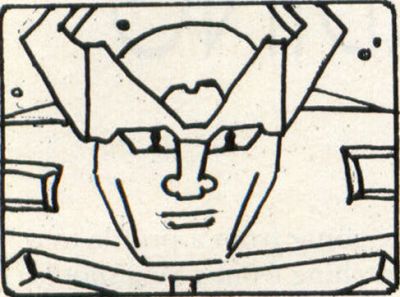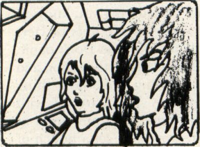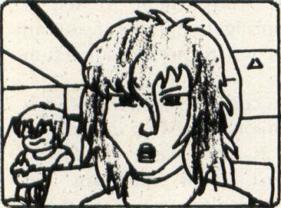 —Cut to: Interior robot. Typical Japanimation types are seen (with two-inch-wide eyes, half-inch-wide mouths and unruly mops of hair). A girl sits a bit back from us, behind the robot's right "eye," while a guy (such as he is) is seen in CU profile. Voices are (naturally) out of synch with the animation and annoying as all get out. The only thing that moves is the girl's mouth and the stars outside the window.