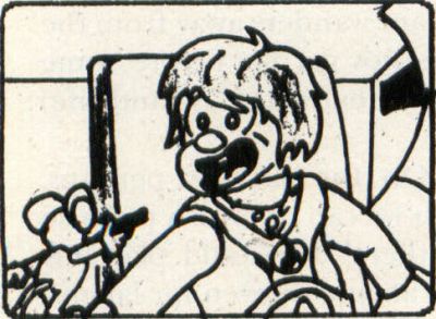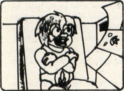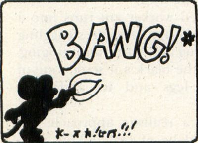 —Suddenly, Megabit Mouse appears at screen left, pointing a pistol at the kid. Kid's head jerks (need I have said it?) to face Mega, and he screams.