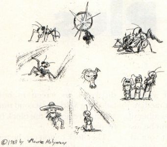And there are more ways to play it than I've described here. When planning an animation or film you have to consider what sort of feeling you want it to convey and adjust your action and imagery to it. So you'd probably start out scribbling little ideas for the ant, and any other characters or items that might appear, in addition to the staging of a scene, trying different styles and approaches. Figure 2 shows a series of my actual rough sketches depicting various ideas for the ants, anteater, and so on that appear in the various ideas.