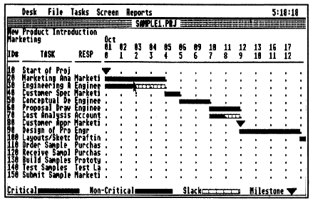 As tasks are set up in Critical Path, they're drawn on the screen as a Gantt chart, one of the standard tools for project management. Milestones (tasks with zero duration that indicate some important point in the project) are shown as inverted triangles, while tasks with non-zero duration are shown in one of three ways. Tasks that delay the finish date of the entire project if they're late are on what is called the "critical path" and are shown in red (on a color monitor). Noncritical tasks are shown in green and their slack time (amount of extra time before they impact the completion date) is shown in black. The project information can be saved at any time.