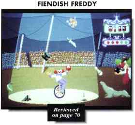 I've seen so many multiplayer competition games that I didn't think I'd ever want to see another. But Fiendish Freddy is a sight for sore eyes. The cartoon graphics are great; they're dazzling and hilarious. I actually found myself snickering at the unfortunate end of high-flying Finola as she plummeted ever so gracefully from the heights of the trapeze, thanks to Freddy "cutting" her act short.
