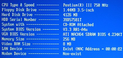BIOS情報で見た機能仕様は、左写真の如くですが、メモリは_珍しく?_256MBのDRAMが刺さったままでした。_幸せ!_