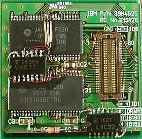 この128MbitsDRAMは、ノート用128MBメモリ・モジュール(EDOタイプ)などに搭載されているチップ(51131656)を、高温ブロアで取り外して用いました。