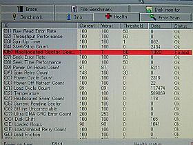 このHDDは、左図のように、1度そのReallocationがありますから、今出ている危険信号(SMARTエラー)は的を射ているのかも知れません。(当初は、これをかなり軽く見ていたのですが、そうではないようです)