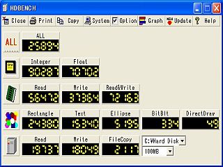 主ドライブに16GB-CFを使っていた時のHDBENCHの実行結果は、甚だ良くないALL値(左図<クリック>)でしたが、今回の1.8インチHDD-20GBでは、随分良い結果になっています。(左図)