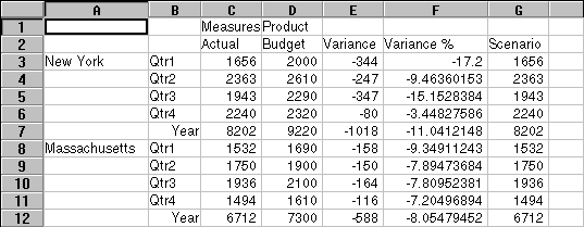 With Essbase, you can retrieve members into grouped, or nested, columns or rows. Row groups containing more than one level of data are nested within single-member row groups. For example, a row group containing Qtr1, Qtr2, Qtr3, and Qtr4 may be nested within a single-member row for a specific region, such as East (see the following illustration). Drilling down to lower levels of database members is one way to retrieve data into nested groups.