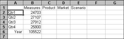 When you retrieve data into an empty worksheet, Essbase returns data from the top levels of each database dimension. The top level is used as a starting point to navigate, or drill down, into levels of detailed data. In the Sample Basic database, the following five dimensions are retrieved: Measures, Product, Market, Scenario, and Year.