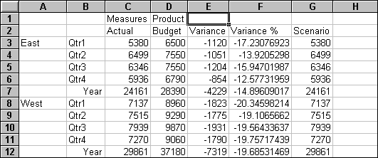 With Essbase, you can drill down to various levels of multidimensional data in the worksheet. For example, if you want to view data for a specific quarter or month rather than an aggregate data value for the whole year, you can drill down on the Year dimension to see more detailed data.